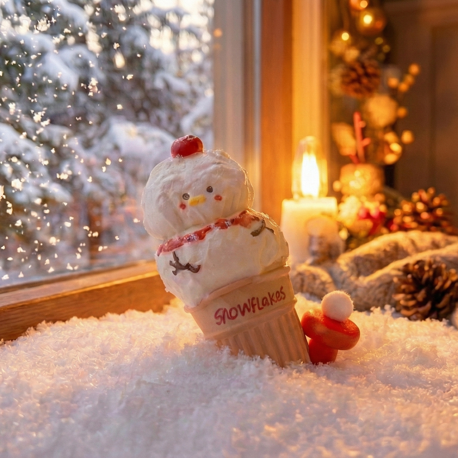 ☑️ Whimsical Design — Ice-cream cone base + snowman scoops + cherry topper