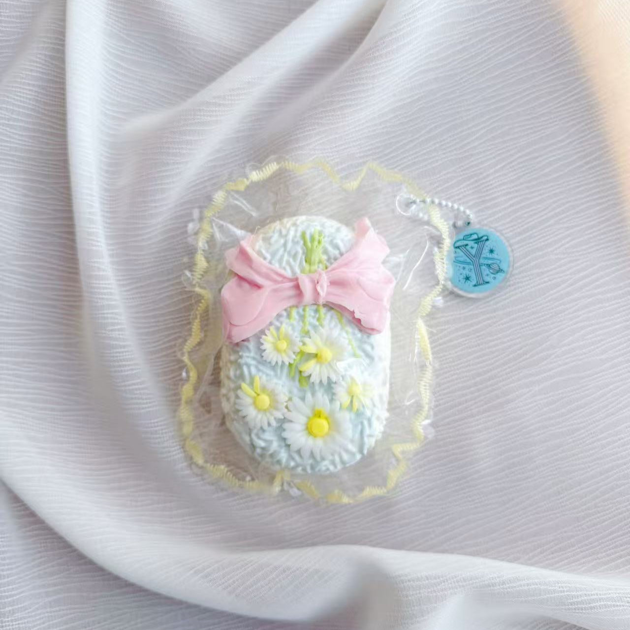 🎀 Ribbon Daisy (Squishy Weight*: +/- 210g)– Oval charm tied with a pink bow, sprinkled with daisy accents