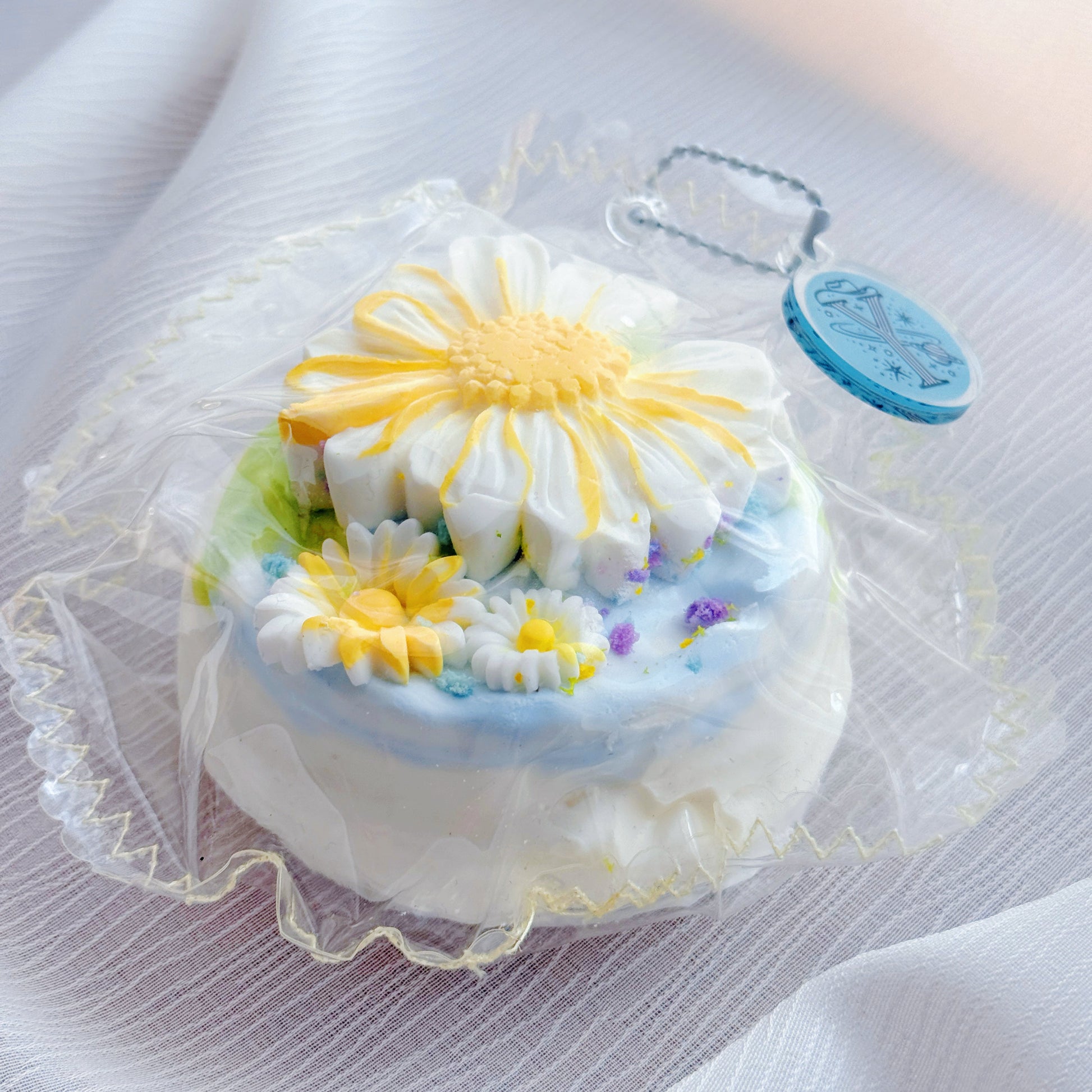 ☀️ Sunshine Garden (Squishy Weight*: +/- 220g)– A bold yellow daisy set against dreamy, soft swirls