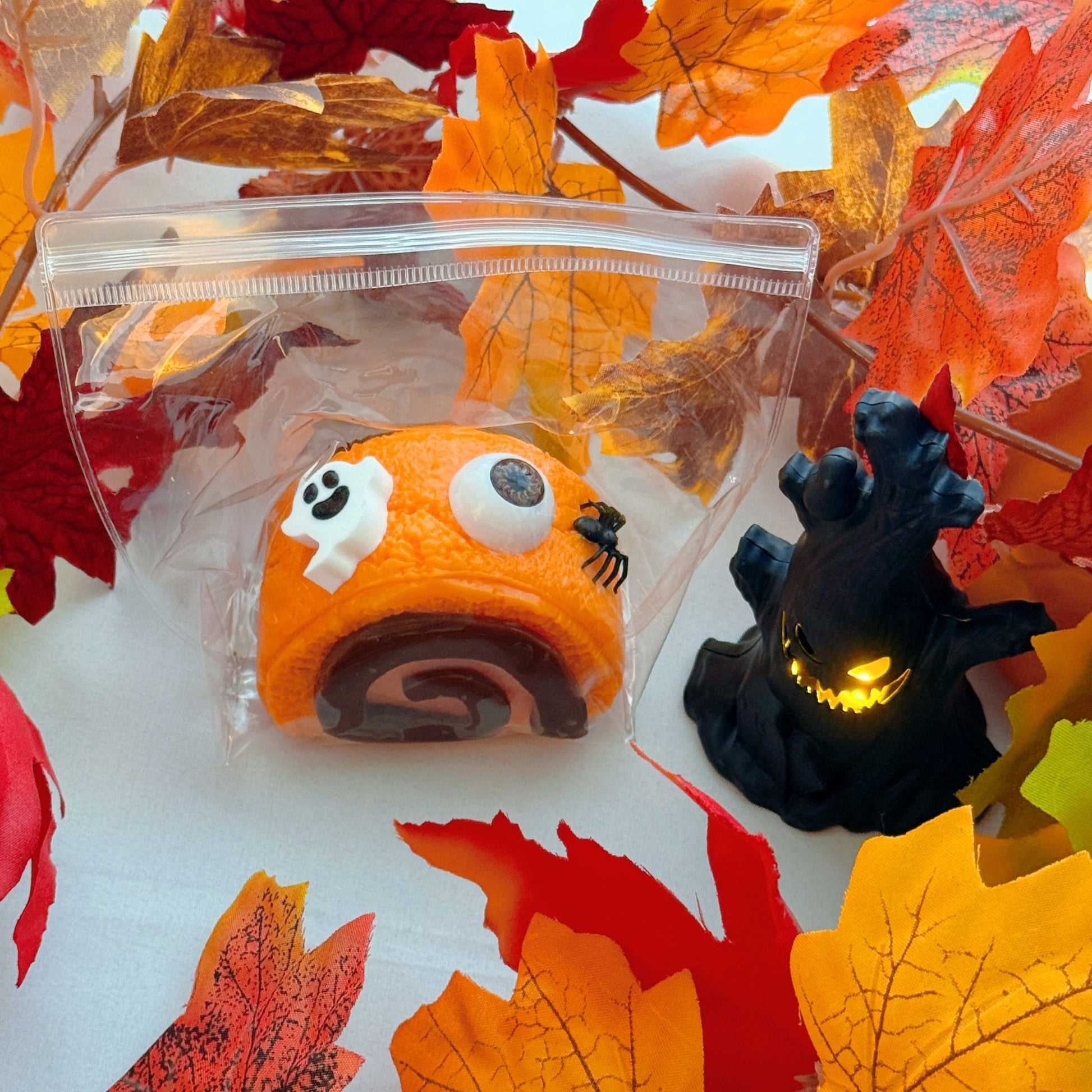 A swirl of spooky fun! đ With its bright spiral roll, cheeky eyeball topping, and playful Halloween accents (pumpkin badge + creepy crawly spider), the Monster Swirl Roll Squishy is a mischievous snack-lookalike that doubles as a festive stress-buster.