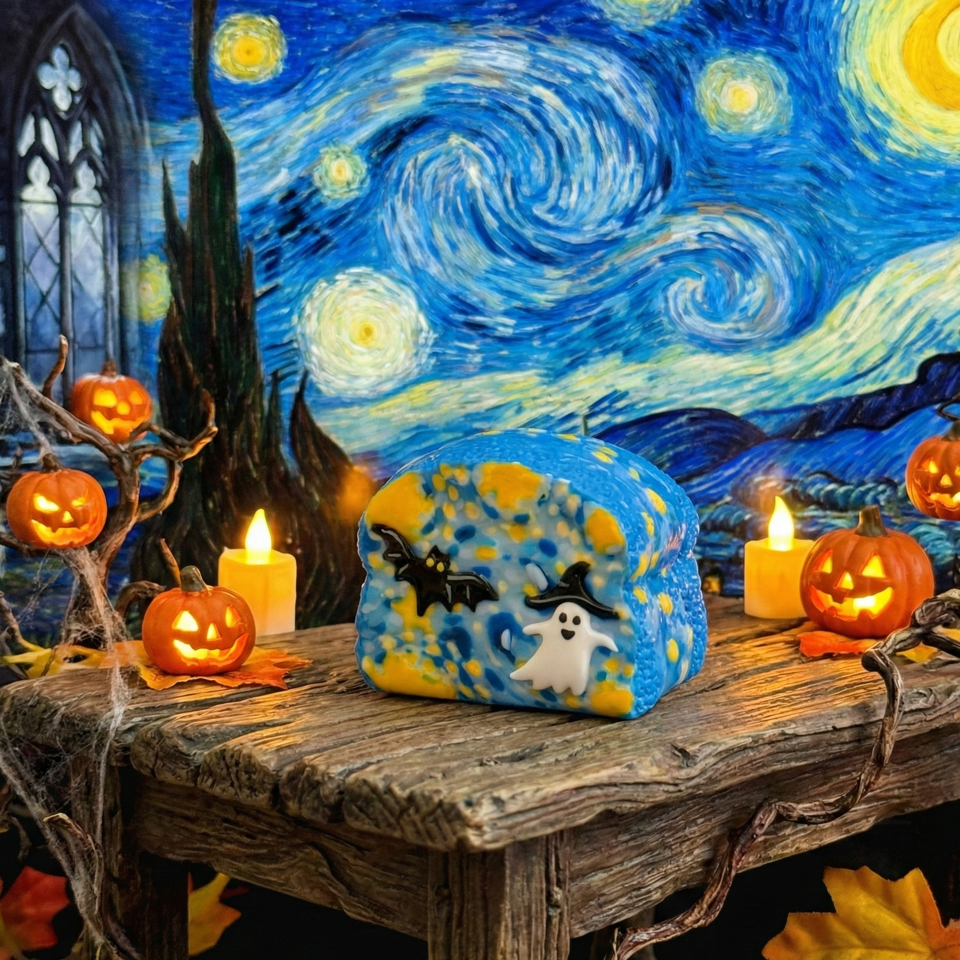 đ Van Ghost Night Squishy takes inspiration from Van Goghâs iconic swirls, adding a ghost twist with flying bats and a cheeky ghost visitor like a bat and a ghost. Equal parts art piece and seasonal fun, itâs the most magical toast youâll ever squeeze.